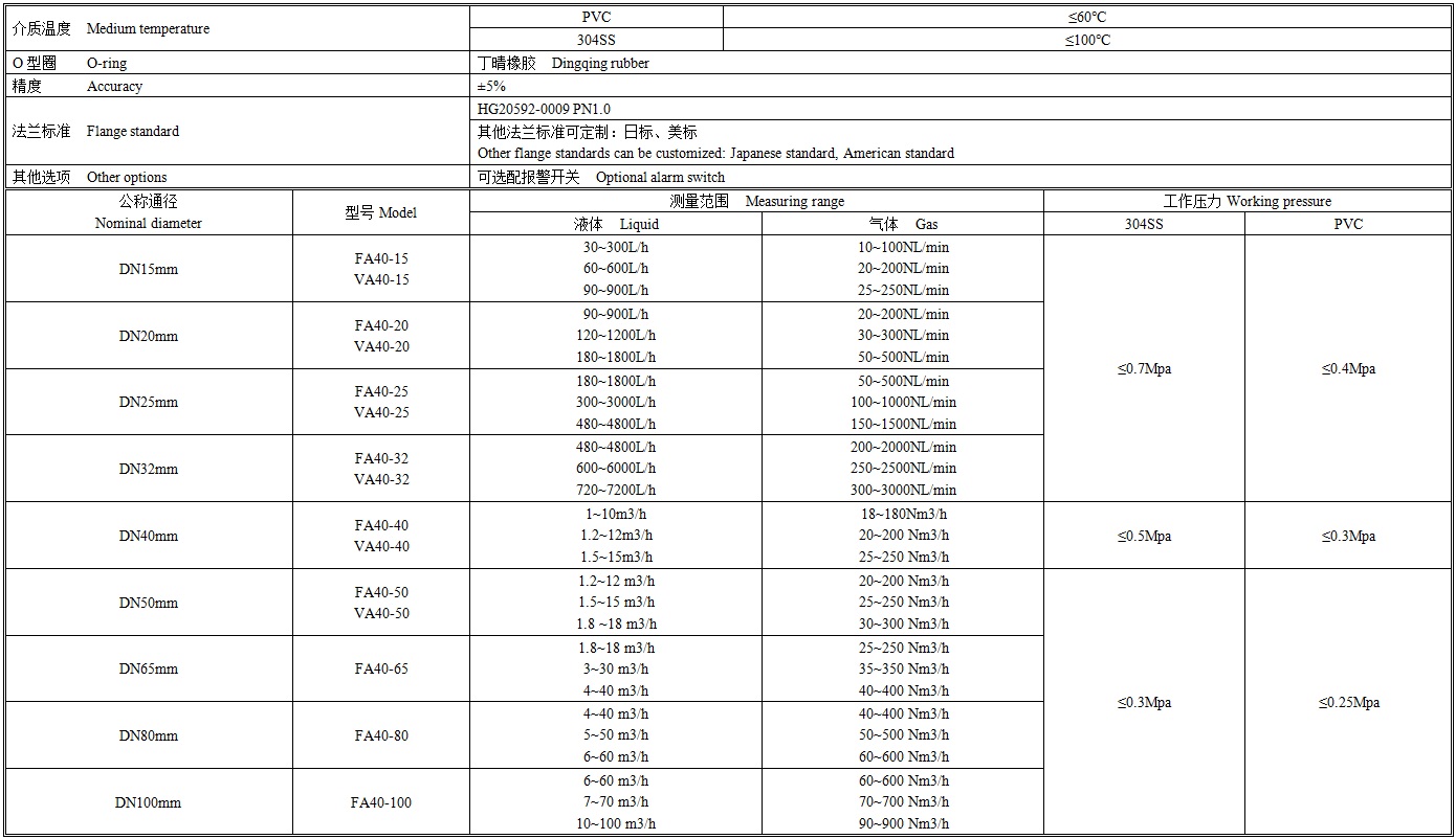 VA40/FA40系列玻璃转子流量计具有灵敏度高、测量范围宽、压力损失小,对仪表前直管段段要求不高等特点。一般用来测量低压、常温、不带颗粒和悬浮物的透明的液体或气体。广泛应用于石油、化工、钢铁、电子、环保、电力、医药等工业领域。