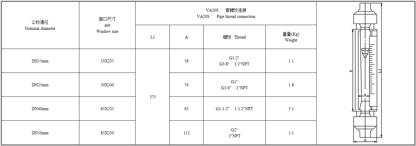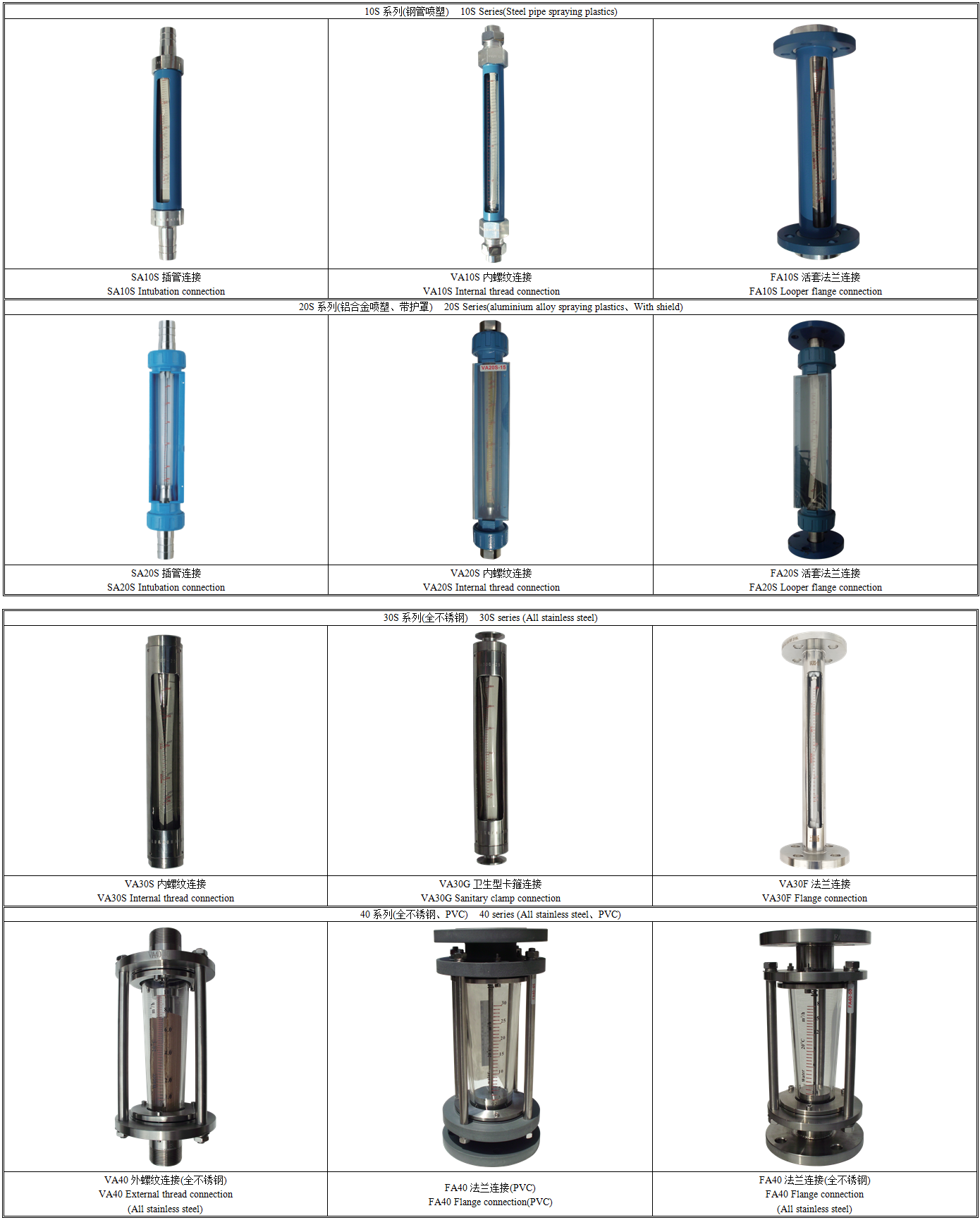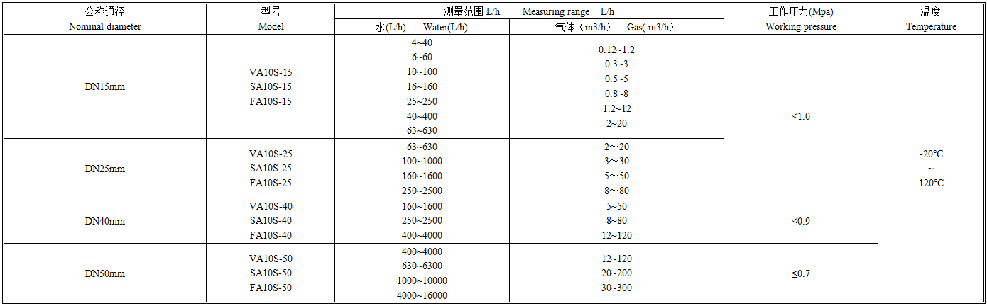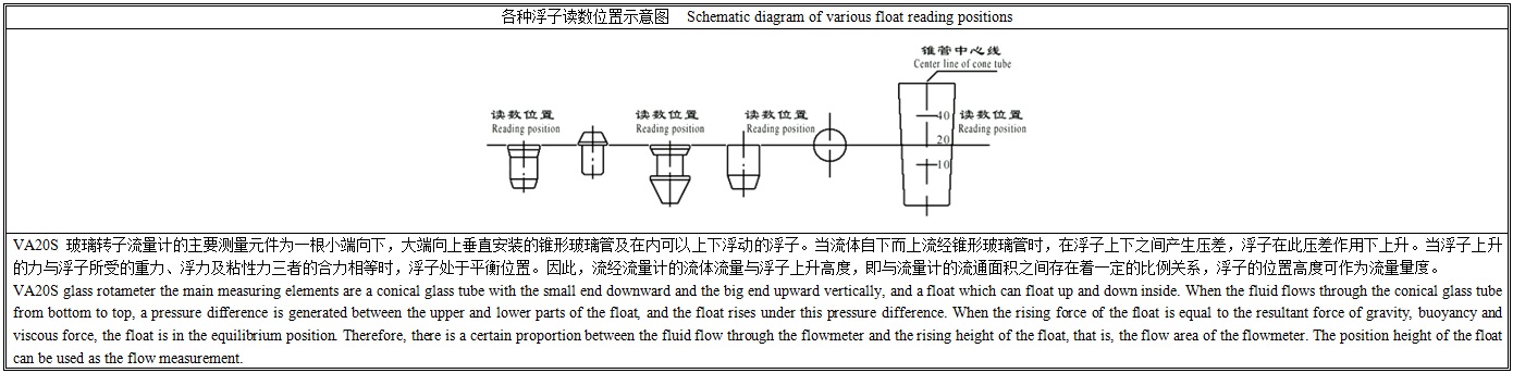 VA/SA20S玻璃转子流量计是我公司的新产品,与国内同类产品比较具有测量精度高,互换性能好,连接方式多种,特别是流量计的流量值为毫米刻度,根据不同流体的温度、压力、密度、黏度等物理量提供实际流量标尺,解决示值修正问题。